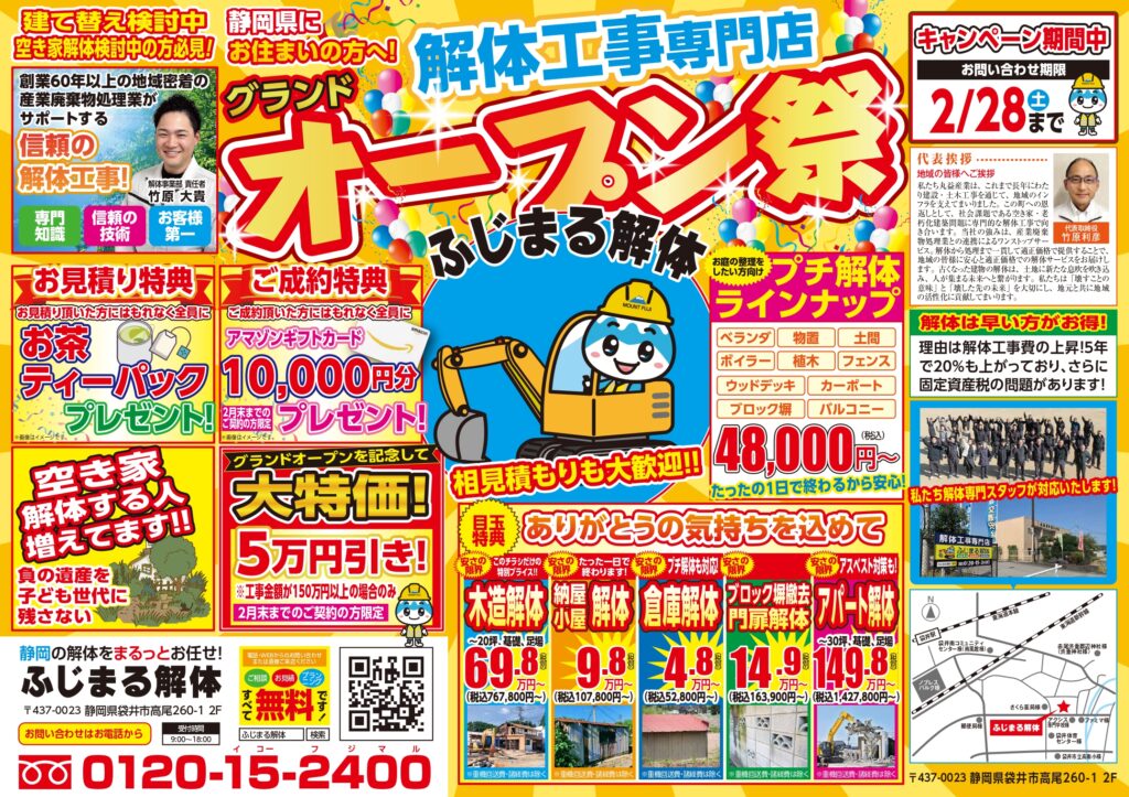 お客様一人ひとりのご要望に真摯に向き合い、安全・安心を最優先に、産業廃棄物の適切な処理までトータルで対応し、高品質な解体サービスを提供いたします。地域の環境にも配慮し、信頼される解体工事専門店を目指してまいります。